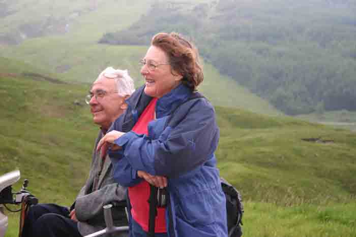 The Extra Challenge was an 8 ½ mile section of the route, suitable for wheelchairs and electric buggies. Around a dozen disabled people, all Scottish except ourselves, met up at the end of a minor road near the Bridge of Orchy, by Rannoch Moor. The day was grey, with very little wind: ideal conditions for midges, and we were each issued with midge poof nets worn over our faces, making it very difficult to recognise each other.